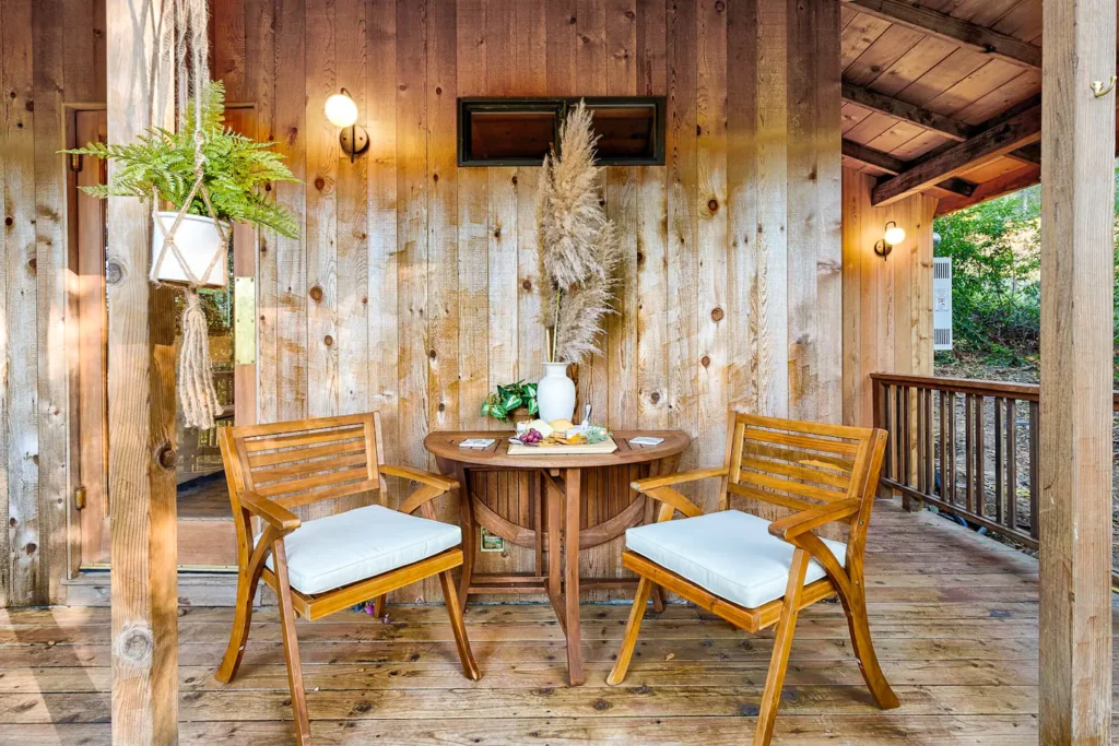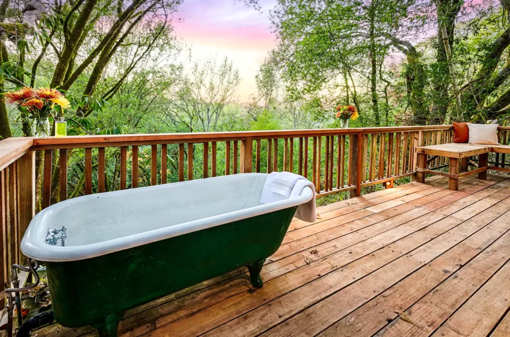 Take advantage of the outdoor shower on the back deck after a warm cup of complimentary French press coffee. Please note this shower and bath are the only shower and bath available on the property, there is no indoor shower.