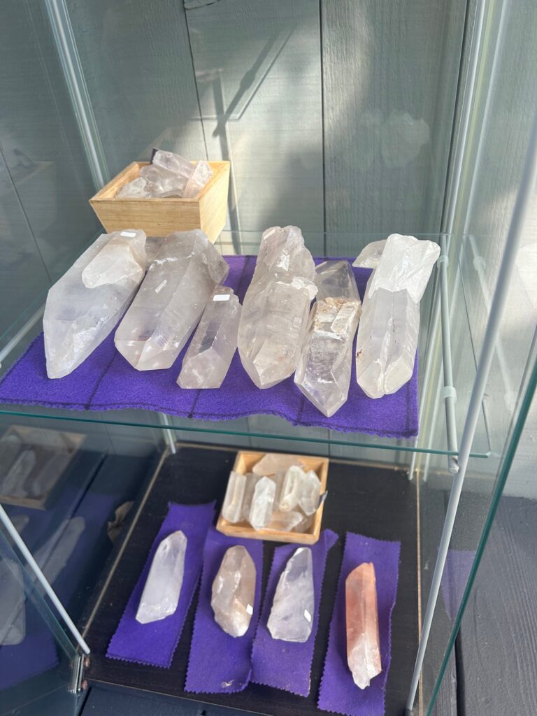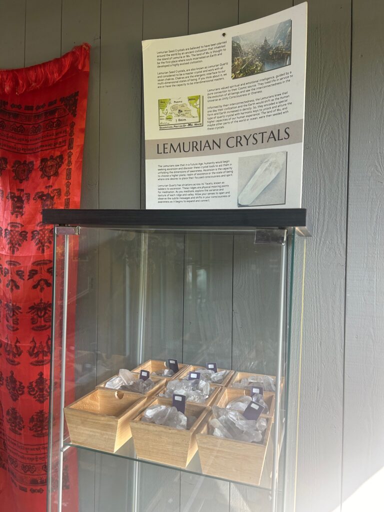 Attendees were instructed to bring a cushion, a blanket, a journal, and an item to offer to the altar. The entryway greeted guests with Halleck’s collection of South American Lemurian crystals, housed in a glass display case, an insight into Halleck’s exploration of spirituality as a foundation and lifestyle. Upon entering the sunken living room, Jarvie had set up a variety of instruments and sound devices, including a guitar, flute-like pipe, harmonium, gong, hand pan drum, and several sound tools sourced from indigenous studies in South America.