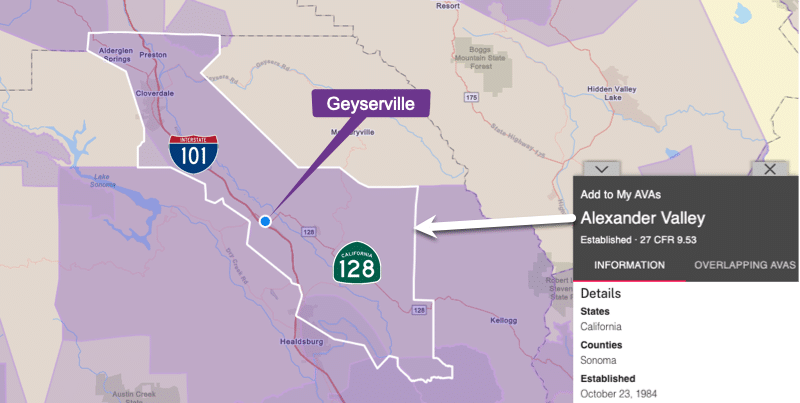 Portions of the Alexander Valley, North Coast, and Northern Sonoma American Viticultural Areas (AVAs) intersect with Geyserville, which is just off California .