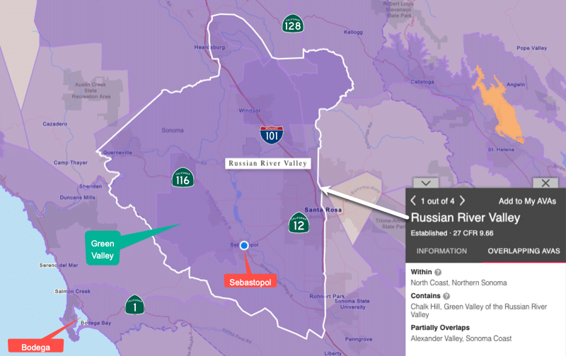Portions of the Green Valley of Russian River Valley, North Coast, Northern Sonoma, Russian River Valley, Sonoma Coast, and West Sonoma Coast American Viticultural Areas (AVAs) intersect with Sebastopol.
