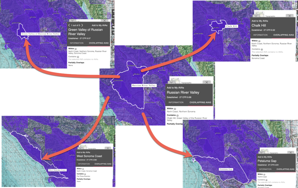 While the Russian River Valley is a unique American Viticulture Area, it overlaps with these AVAs. That means a portion of them intersect with the Russian River Valley AVA on the map.